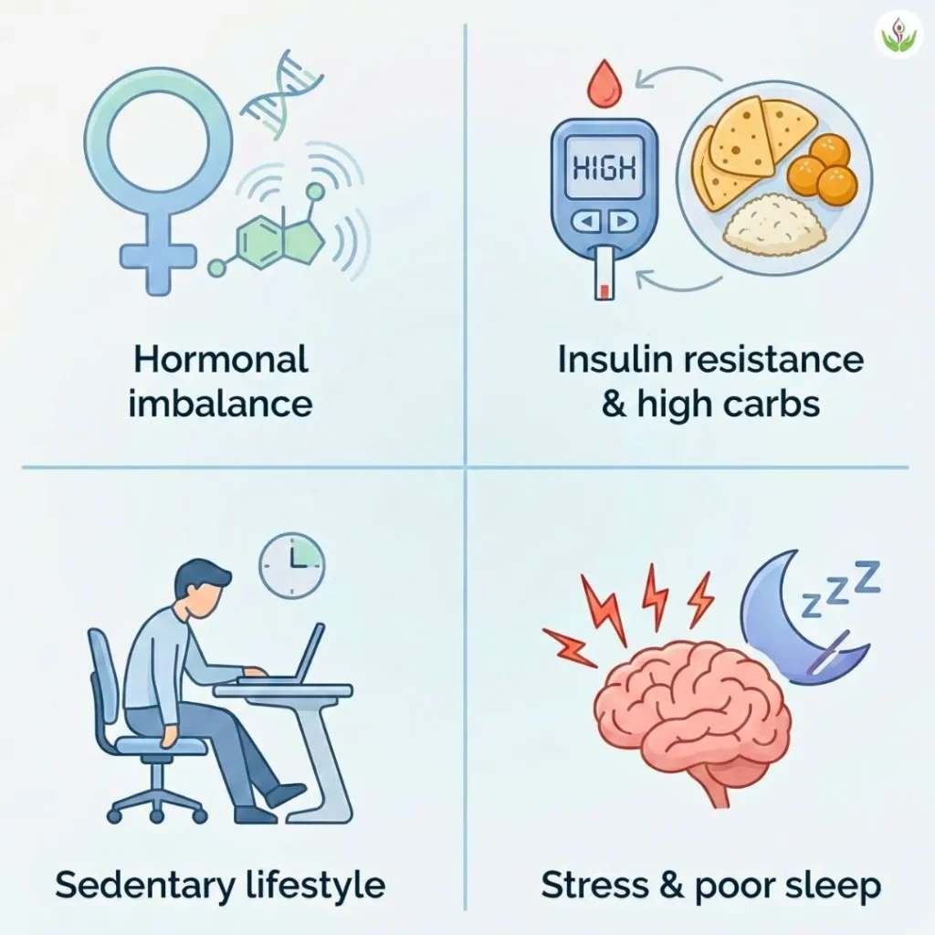 PCOD or PCOS, thyroid dysfunction, and low testosterone in men all slow metabolism and increase central fat. We check these hormones and support them where needed instead of only reducing calories. - Insulin resistance and high carbohydrate diet