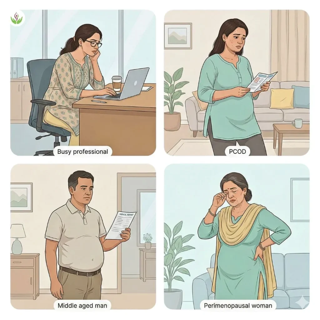 - You are a busy professional with long sitting hours, late dinners, and growing central obesity around the waist.